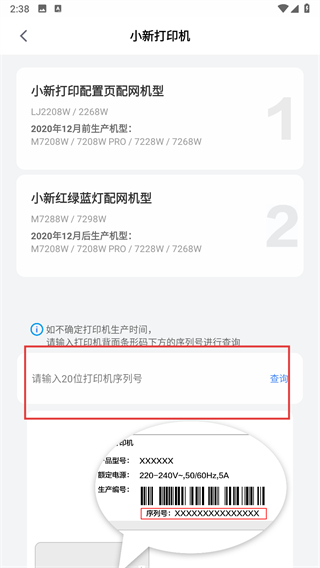 4、在小新打印機頁面,輸入20位序列號后點擊查詢完成匹配。