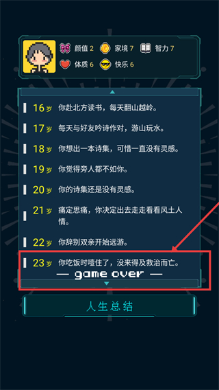 3、角色成長中需均衡提升【體質】,避免因意外事件(如吃飯噎住)導致提前結束,可通過遠游增強體質。