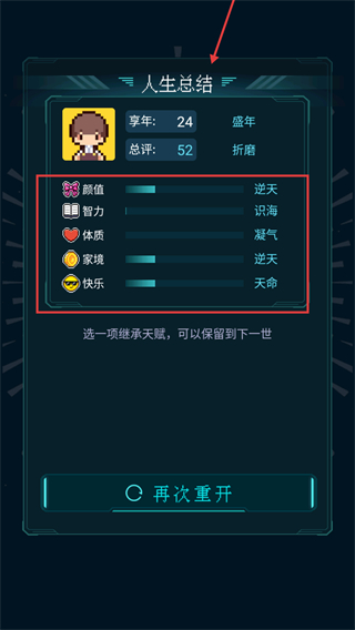 4、人生總結界面選擇繼承【家境】或【快樂】等逆天屬性,保留優勢到下一世,助力開啟更高評分人生路徑。
