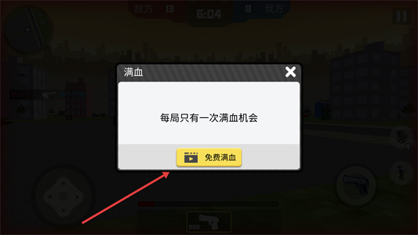 3、若角色血量不足,可利用每局一次的“滿血”機會(觀看廣告免費滿血),恢復狀態繼續戰斗。