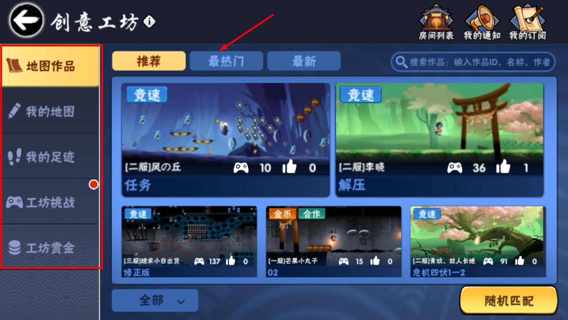 4、在地圖作品界面選【推薦】-【最熱門】-【最新】標簽,可篩選游玩競速-任務等類型的玩家自制地圖。