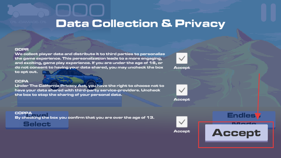 1、進入游戲需先勾選相關隱私選項,點擊【Accept】按鈕同意,才可開始。