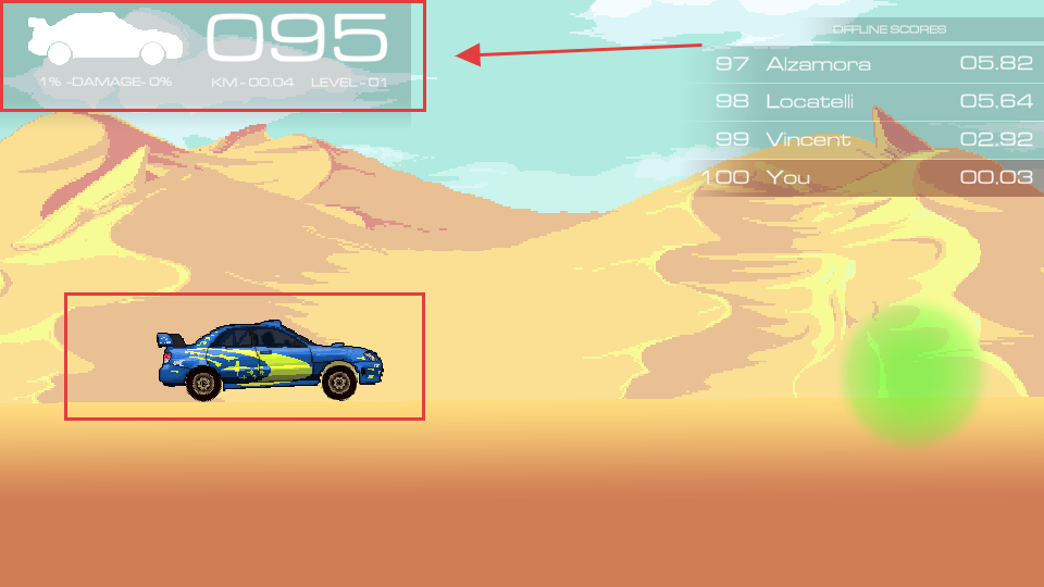2、游戲中顯示車輛狀態和成績,藍色賽車在沙漠賽道行駛,注意躲避障礙。