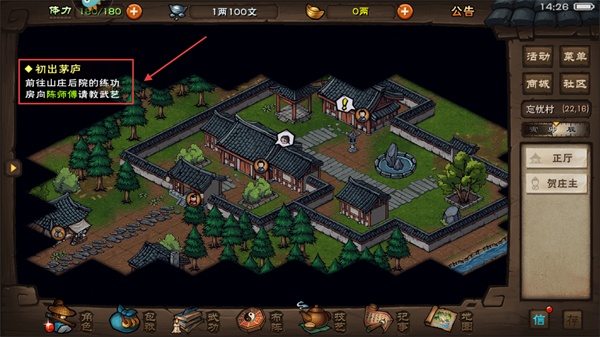 2、按【初出茅廬】任務指引,前往山莊后院練功房,向【陳師傅】請教武藝推進新手任務流程。