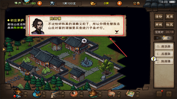 3、與【陳師傅】對話接取任務,需前往山莊對面酒鋪購買【燒刀子】酒,完成后可繼續(xù)請教武藝。