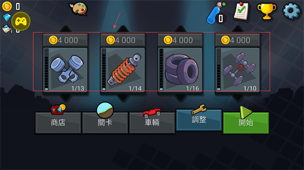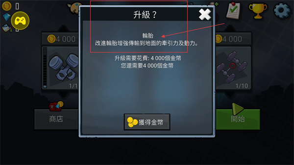 4、升級【輪胎】可增強地面牽引力與動力,提升車輛抓地表現,升級前需積累4000金幣以完成解鎖。