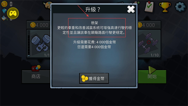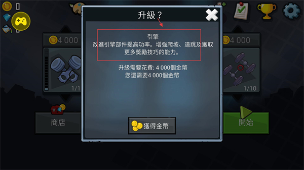 2、玩家可升級【引擎】可提升車輛功率,增強爬坡、速跳能力,助力獲取更多獎勵,升級需準備4000金幣。