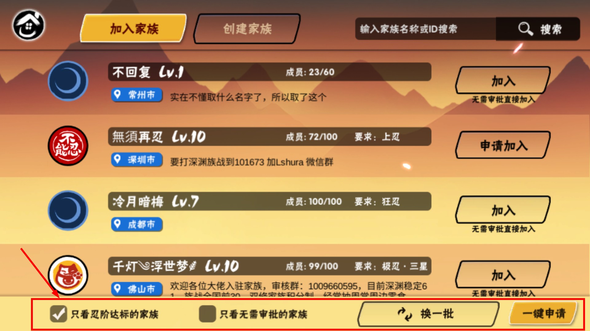 2、在家族列表界面,勾選【只看忍階達標的家族】可精準篩選,還能點擊【換一批】刷新家族列表。