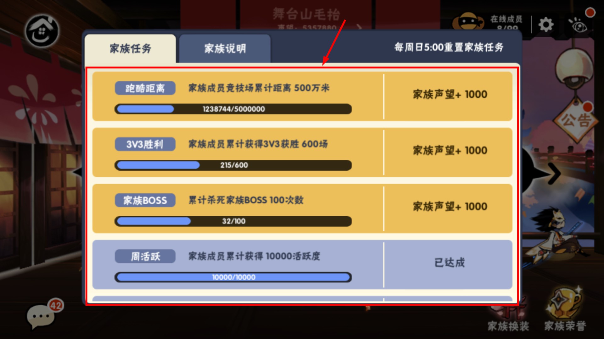 4、家族任務包含【跑酷距離】累計、【3V3勝利】場次等,完成可獲【家族聲望】,助力家族發展。