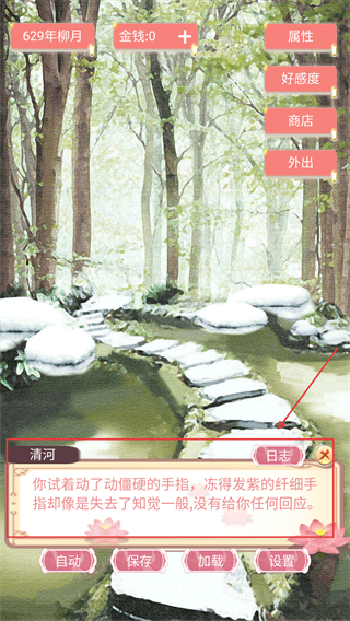 2、在游戲場景中查看【清河】的劇情文本,同時可通過【屬性】-【好感度】等按鈕管理角色狀態。