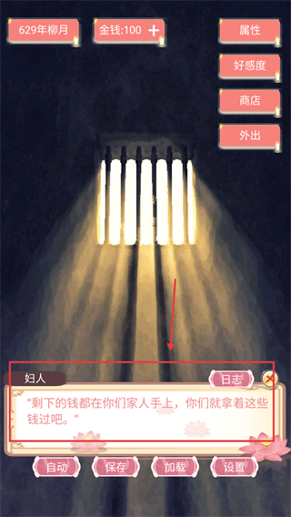 4、查看【婦人】的劇情文本了解故事發展,同時注意【金錢:100】的變化以便后續養成操作。