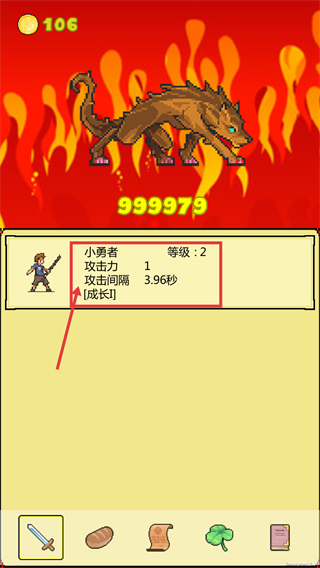 1、當前操控【小勇者-等級-2】,其【攻擊力-1】【攻擊間隔-3.96秒】,需積累金幣激活【成長I】來提升戰斗能力。