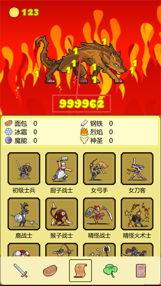 2、界面解鎖【初級士兵】【廚子戰士】等戰斗單位選項,當前【面包-0】【鋼鐵-0】等資源不足,需先通過戰斗積累資源。
