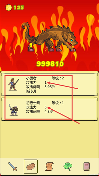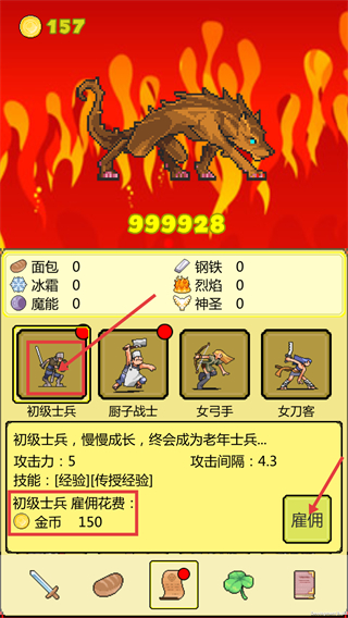 3、【初級士兵-攻擊力-5】【攻擊間隔-4.3秒】,具備【經驗-傳授經驗】技能,攢夠【150-金幣】后點擊雇傭可大幅提升隊伍戰力。
