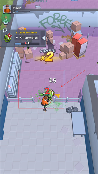 2、靠近僵尸觸發(fā)自動攻擊,擊殺后達(dá)成【1/4】進(jìn)度,同時觸發(fā)【COMBO-x2】連擊效果,可額外提升擊殺收益(如+15數(shù)值獎勵)。
