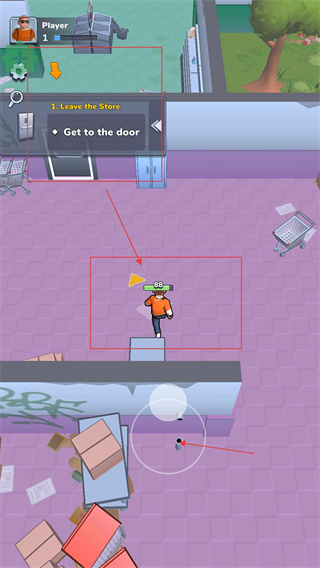 4、任務(wù)更新為【Get-to-the-door】,拖動搖桿引導(dǎo)角色向出口方向移動,避開剩余障礙物,最終抵達(dá)門口完成商店逃生任務(wù)。