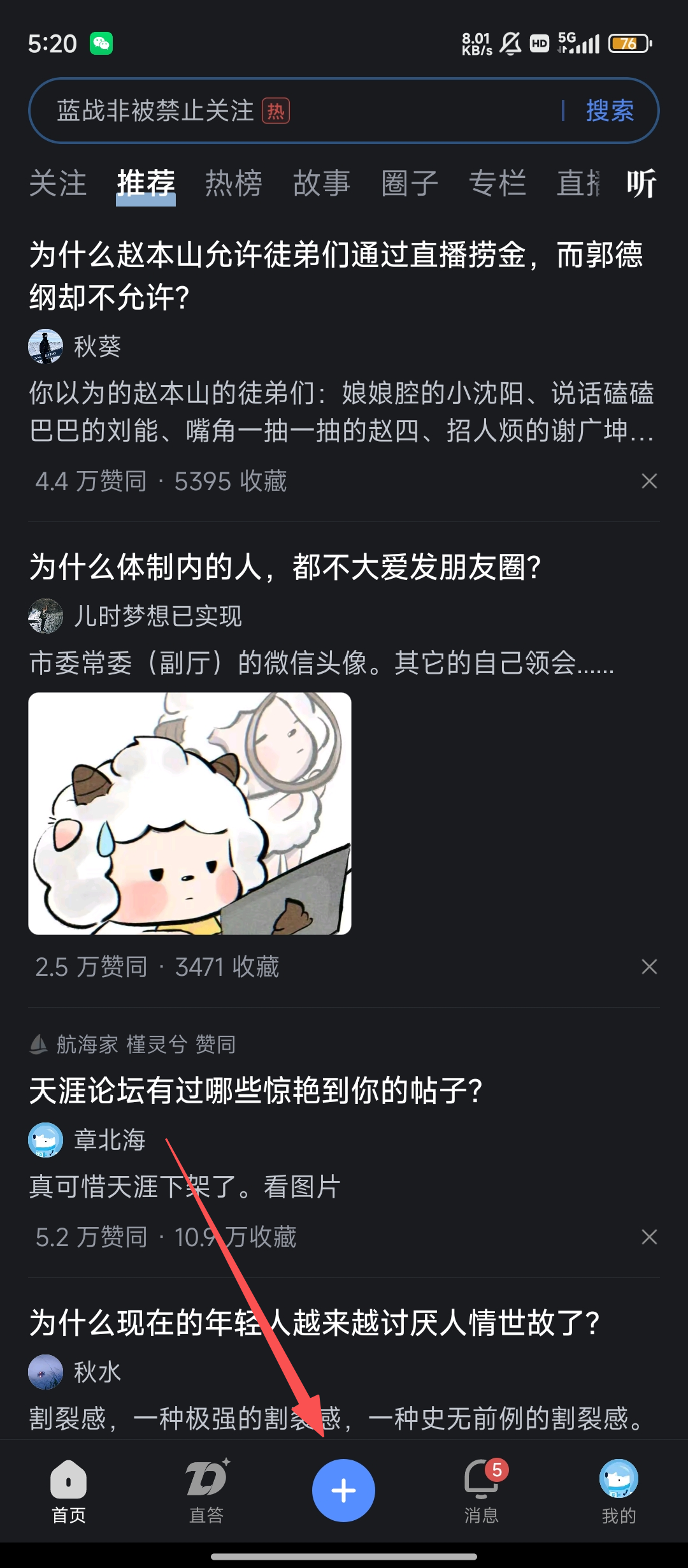 1、打開知乎APP后,瞧見底部中間的藍色加號按鈕,點擊它就能進入創作選擇界面啦。