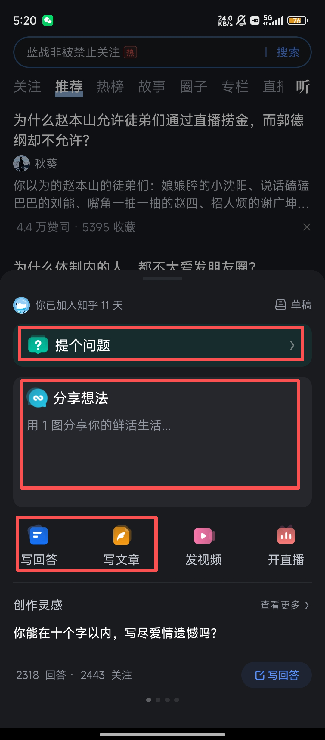 2、在彈出的創作選項里,你可以選【提個問題】、【分享想法】等來開始創作哦。