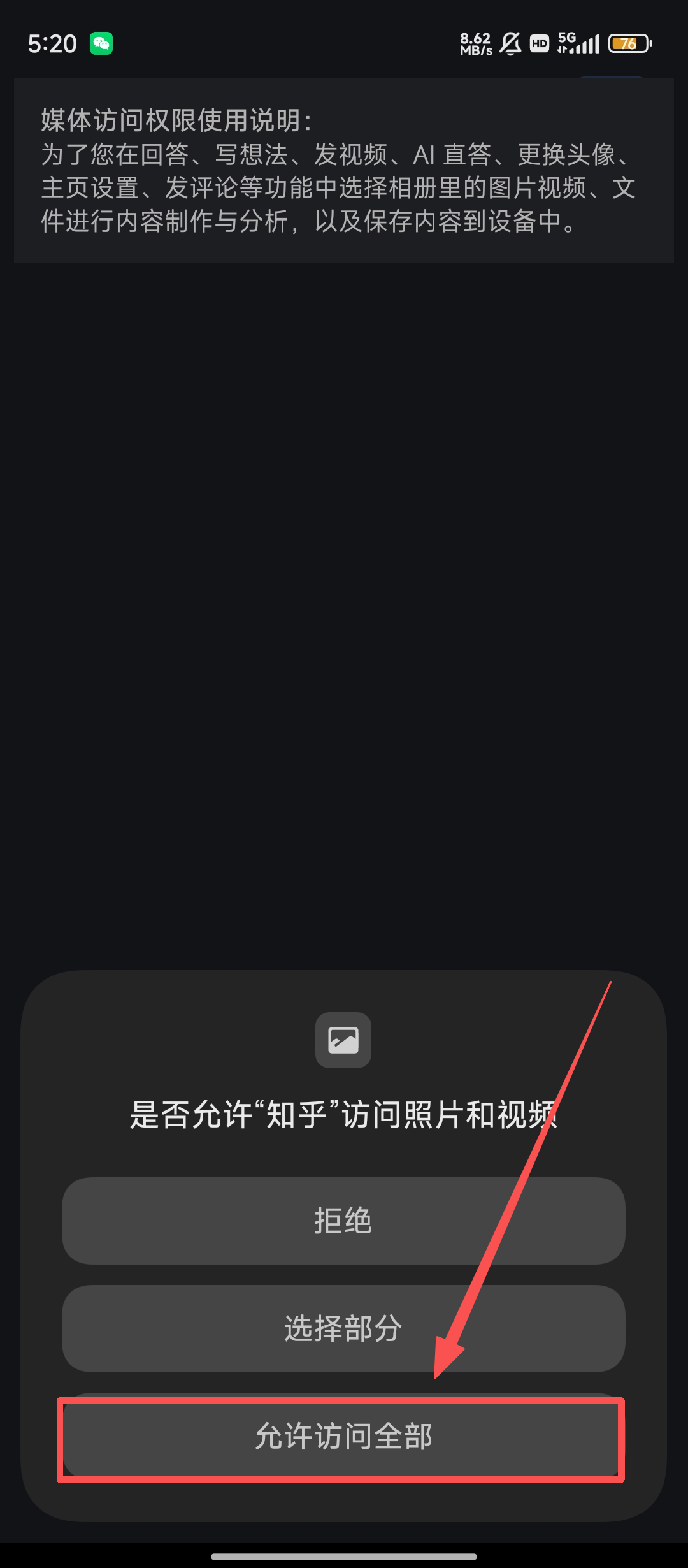 3、當需要用到照片或視頻時,會彈出權限說明,此時點擊【允許訪問全部】,這樣就能方便后續選取素材啦。