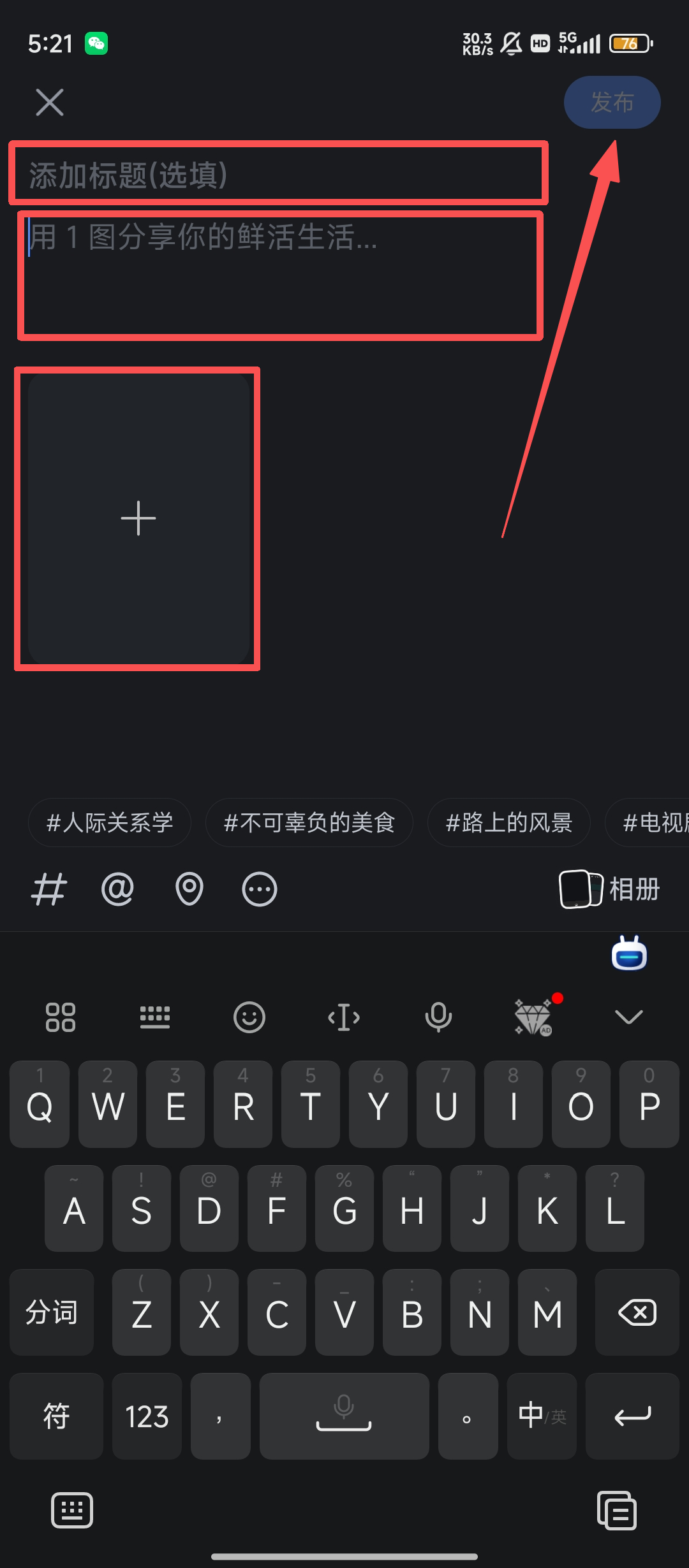 4、進入編輯頁面后,添加標題、寫下內容,還能插入圖片,都弄好后點擊右上角【發布】,就能投稿啦。