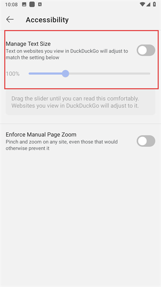 4、在輔助設(shè)置頁(yè)開(kāi)啟Manage Text Size開(kāi)關(guān),拖動(dòng)滑塊調(diào)整到合適的文字大小。