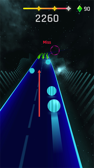 1、需跟隨節奏點擊軌道上的【藍色球體】,避免出現【Miss】提示,同時提升分數。