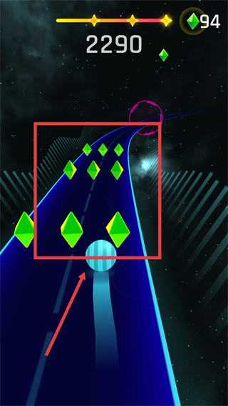 3、跟隨節奏對軌道上的【藍色球】做對應操作,確保動作準確獲取分數,同時積累鉆石。