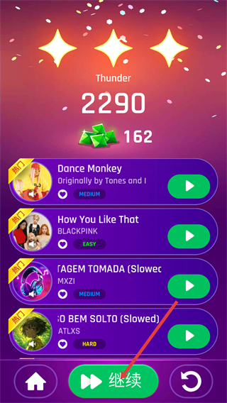 4、完成游戲歌曲的跑道,游戲節奏后點擊【繼續】按鈕進入下一關游戲提升體驗。