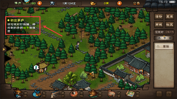 1、前往忘憂村的打鐵鋪,找到張鐵匠并交付挖到的【赤銅】,完成初出茅廬任務的關鍵步驟。