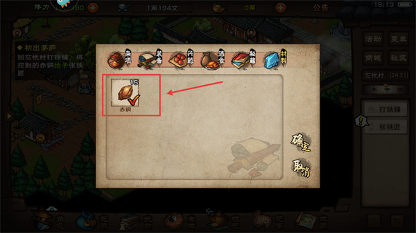 2、打開背包界面查看【赤銅】數量,確認擁有足夠的材料,以便后續交付給鐵匠推進任務。