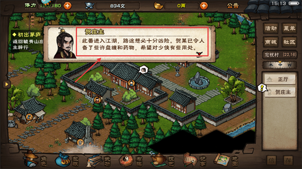 4、與【賀莊主】對話,獲取他提供的盤纏和藥物,為進入江湖的旅途做好物資準備。