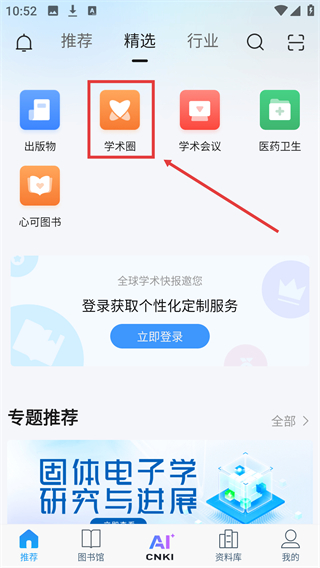 1、在界面上方找到【學術圈】選項并點擊,可進入對應板塊。