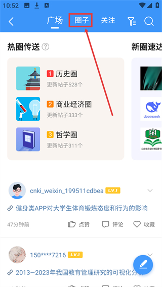 2、進入【學術圈】頁面后,點擊頂部的【圈子】標簽,即可切換到圈子列表頁面,查看熱圈傳送等內容。