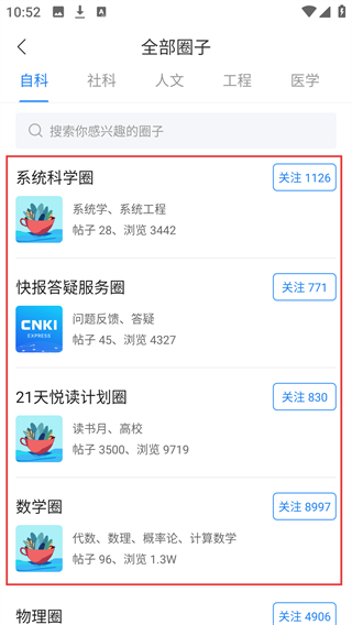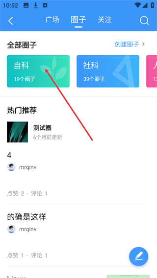 3、進入【圈子】頁面后,點擊【自科】分類按鈕,該分類下包含19個圈子,可查看對應圈子內容。