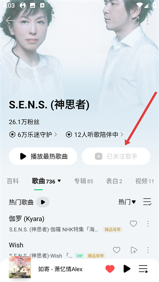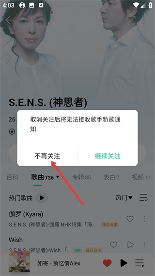 3、在歌手主頁,點擊【已關注歌手】按鈕彈出操作確認框呀。