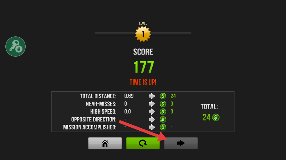 4、完成關卡后獲取獎勵,點擊繼續按鈕重新挑戰,提升分數和駕駛技巧。