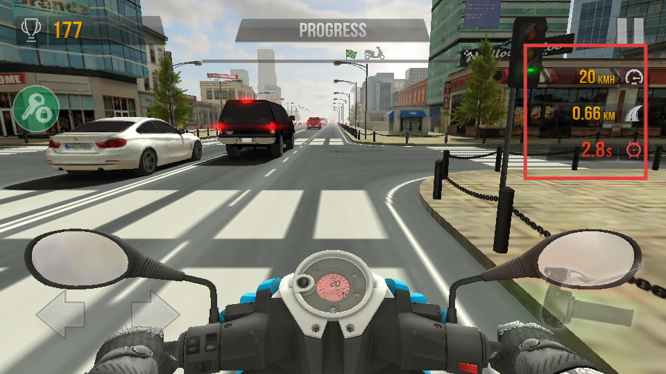 2、操控摩托車方向,控制速度,在城市道路上行駛,躲避車輛,推進任務進度。