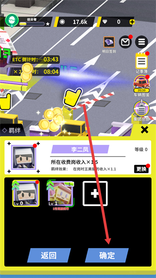 4、確定招募員工王美麗后,點擊【確定】按鈕,讓她入職1號收費崗,利用其收入加成屬性,提升收費站收益。