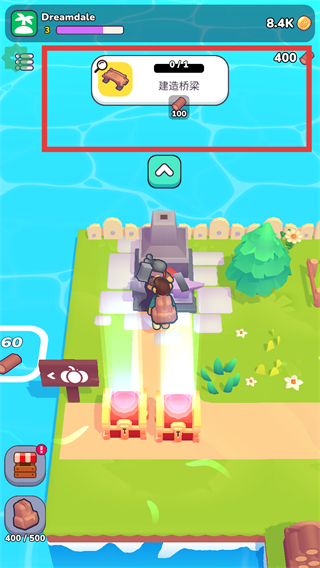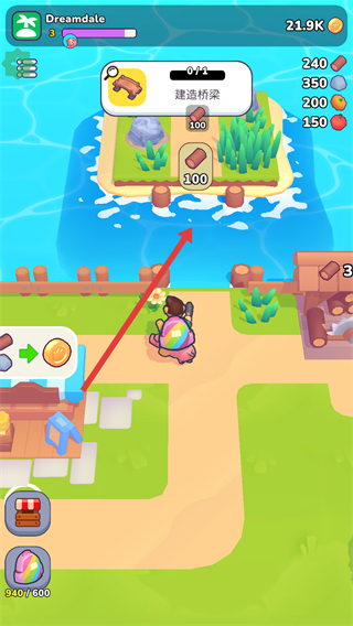 2、操控角色移動到橋梁建造點,消耗100個木頭建造。