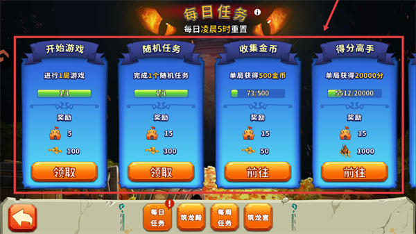 1、完成【進行1局游戲】【完成1個隨機任務(wù)】等每日任務(wù),領(lǐng)取【城堡】【金幣】獎勵,快速積累資源提升游戲進度。