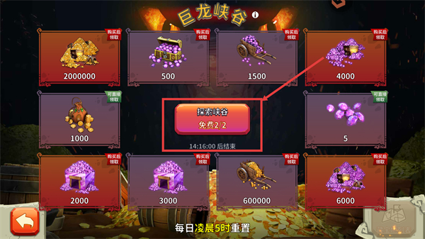 3、使用【探索峽谷】免費次數(shù)獲取資源,優(yōu)先領(lǐng)取可直接獲取的道具,積累【金幣】【寶石】助力游戲發(fā)展。