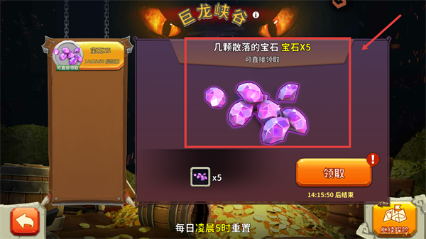 4、探索峽谷后及時領(lǐng)取【幾顆散落的寶石】,積累【寶石X5】資源,用于后續(xù)龍類培養(yǎng)或解鎖新內(nèi)容。
