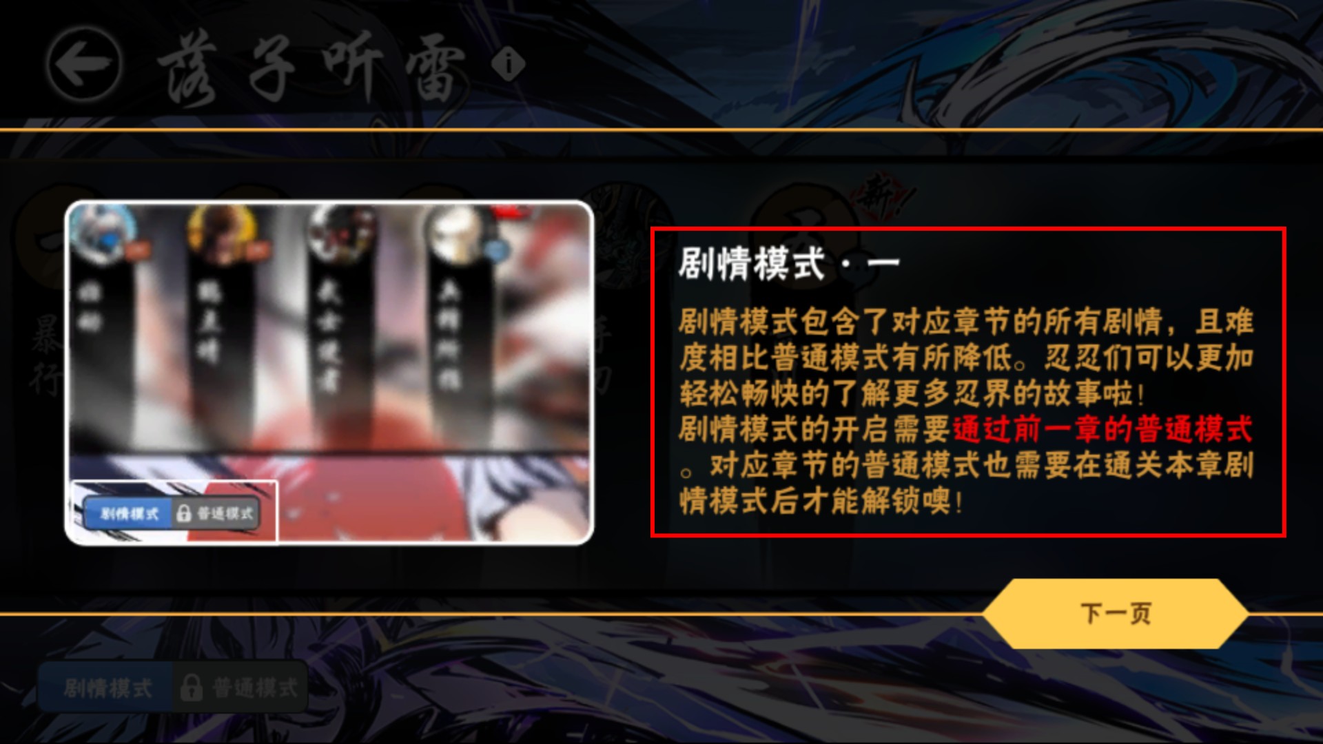 2、解鎖【劇情模式】需先通關前一章普通模式,該模式難度更低,能輕松了解忍界故事且體驗流暢。