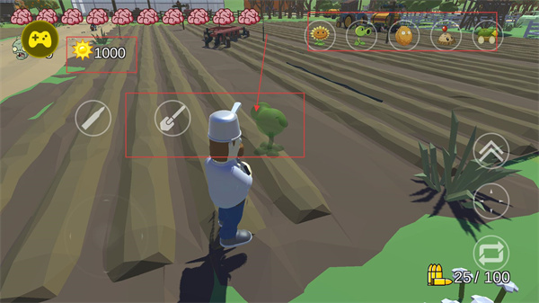 1、消耗太陽資源(如1000太陽)解鎖【豌豆射手】植物,將其種植在農田區域,植物會自動攻擊接近的僵尸,補充自身的輸出火力。