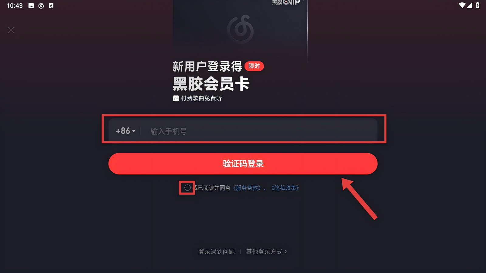 4、接著在登錄界面,我們輸入手機號,勾選同意條款后點擊【驗證碼登錄】,就能完成新賬號的登錄切換啦。