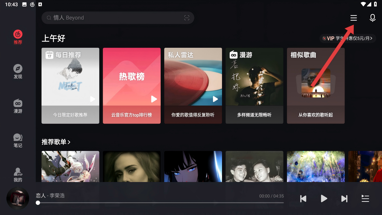 1、在【網易云音樂】主頁,點擊頁面右上角的三條橫線菜單按鈕,就能展開功能列表啦。