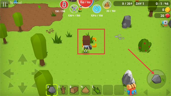 4、重新進入游戲后,靠近【樹】后使用【手】圖標操作砍樹,收集木材資源存入物品欄。