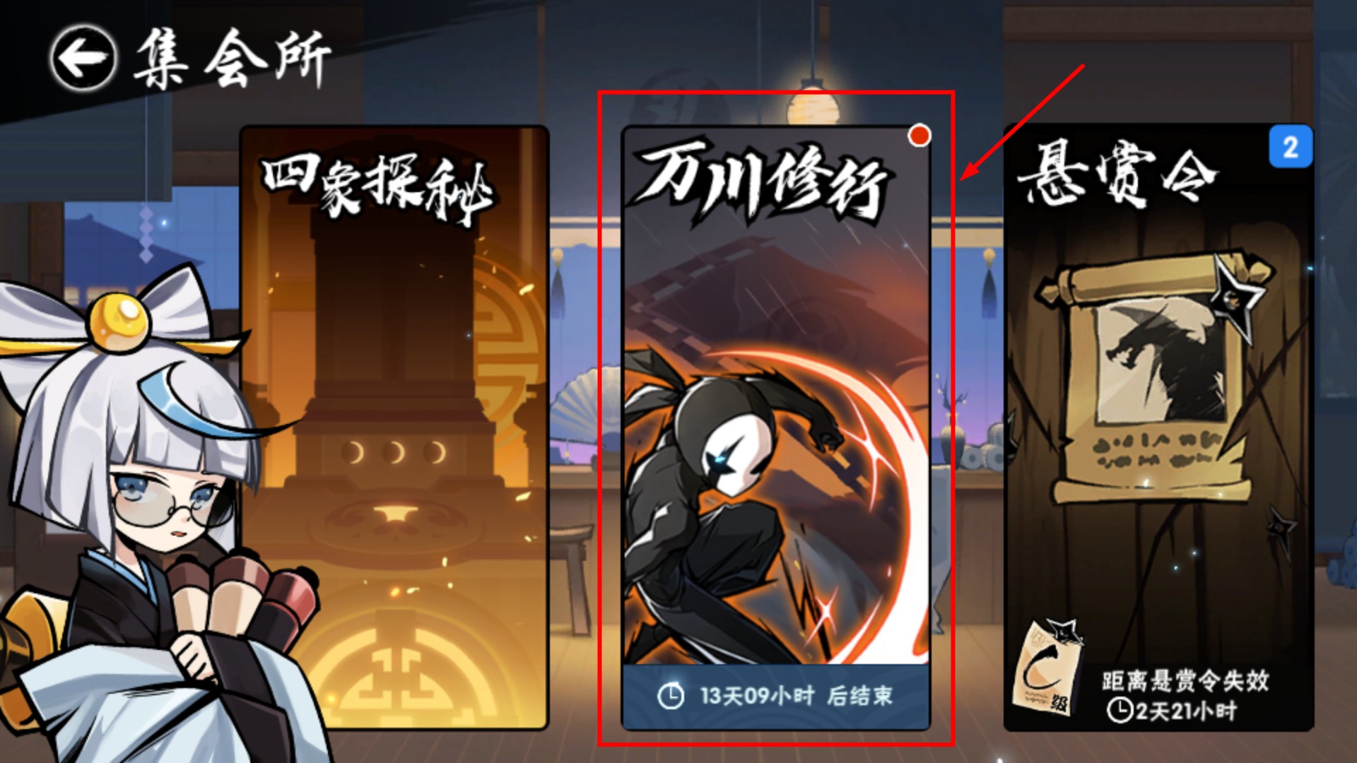 1、在集會所找到【萬川修行】活動入口,該活動將在【13天09小時】后結束,建議盡早參與拿獎勵。