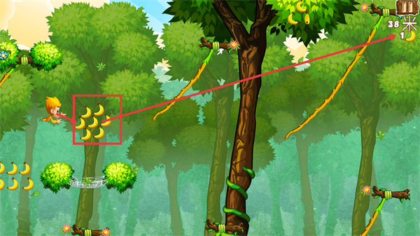 2、在叢林場(chǎng)景里,操控角色靠近【香蕉簇】完成收集,同時(shí)關(guān)注當(dāng)前【38-米】的前進(jìn)進(jìn)度,逐步推進(jìn)冒險(xiǎn)距離。