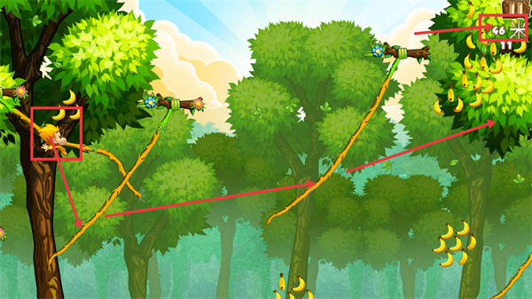 3、借助場(chǎng)景中的【藤蔓】進(jìn)行擺動(dòng)移動(dòng),既能推進(jìn)到【66-米】的更遠(yuǎn)進(jìn)度,也能收集沿途分布的【香蕉簇】。
